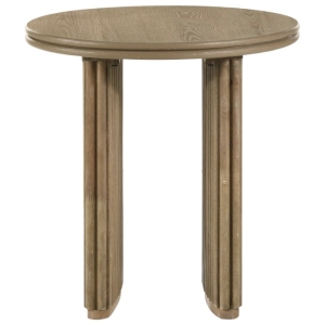 Designed with sculptural curves and architectural texture, this round end table brings warmth and refinement to any room. Its circular top rests over a curved pedestal base detailed with vertical reeding, all finished in a distressed light brown tone. Crafted from engineered wood and ash veneer, this accent table blends organic charm with structural rhythm—perfect beside a sofa, lounge chair, or bed.