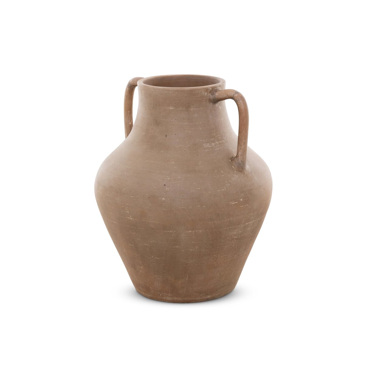 Aged terracotta is lightly antiqued, bringing a new, natural finish to this Grecian-style vase with slim arch handles. Hand-thrown clay ensures each piece has unique character. Not water-tight; for decorative use only.