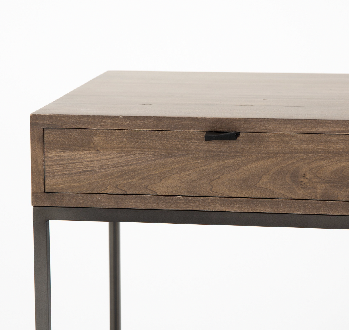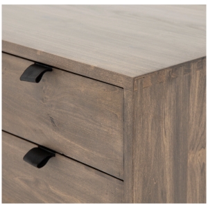 Inspired by clean mid-century design, greyish auburn poplar offers plenty of desk storage by way of three spacious drawers. Metal-secured leather pulls add a textural element of surprise. File drawer for handy storage of legal and letter sized documents. Cabinet can be styled on either side of desk for great flexibility in any space.