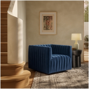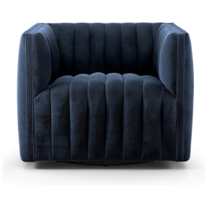 A modern take on the classic library chair, luxurious, Italian-inspired seating features dramatic channeling for trend-forward texture and a sumptuous sit. Upholstered in a velvety poly-blend fabric. A 360-degree swivel delivers from every angle.