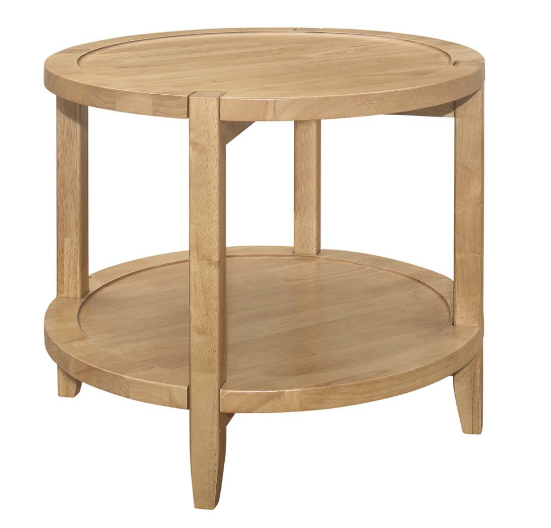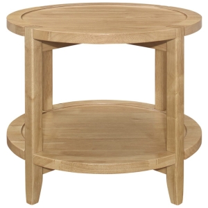 Encourage a warm, welcoming ambiance with the choice of a modern farmhouse end table. Its round profile is crisp and familiar, while offering movement and flowing energy. The table is crafted in rubberwood for optimal quality and received a warm maple finish that’s stylish without overwhelming surrounding decor. A slight tray effect adds depth the tabletop and lower shelf, creating another touch of texture and dimension. The table is designed with a full lower shelf, offering a perfect spot for a personalized display of books or other decor.