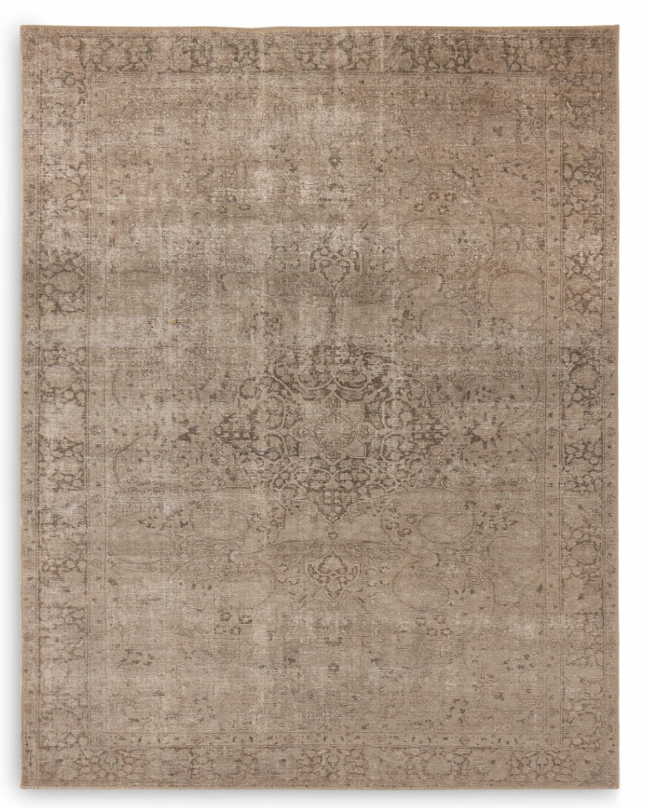 A jute-blend rug is power-loomed in Egypt. Each pattern is created from a high-quality scan of a vintage rug. A team of graphic designers then perfects the pattern and colors to closely resemble the original rug. The result: a textural and versatile piece that looks authentically antiqued. Allow for a slight variation in size, up to 5%, for this rug.