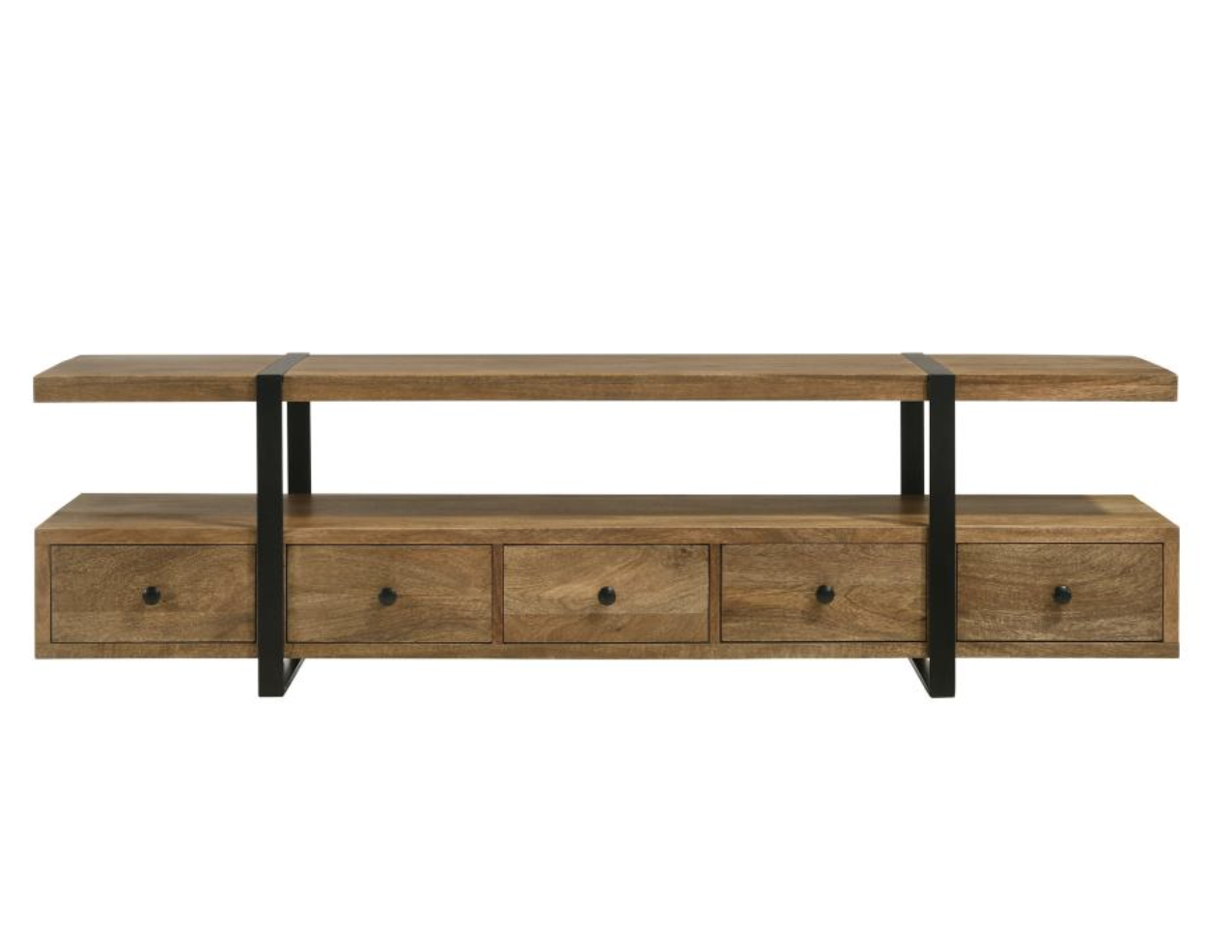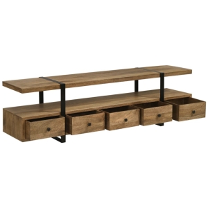 Perfectly suited for televisions up to 75″. Constructed from robust Mango wood and accentuated with metal, it features a distinctive floating shelf, supported by sleek gunmetal-finished legs.