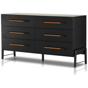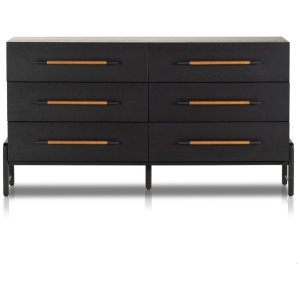 Ebony-finished oak forms a clean silhouette for six spacious drawers with iron hardware wrapped in tan top-grain leather.